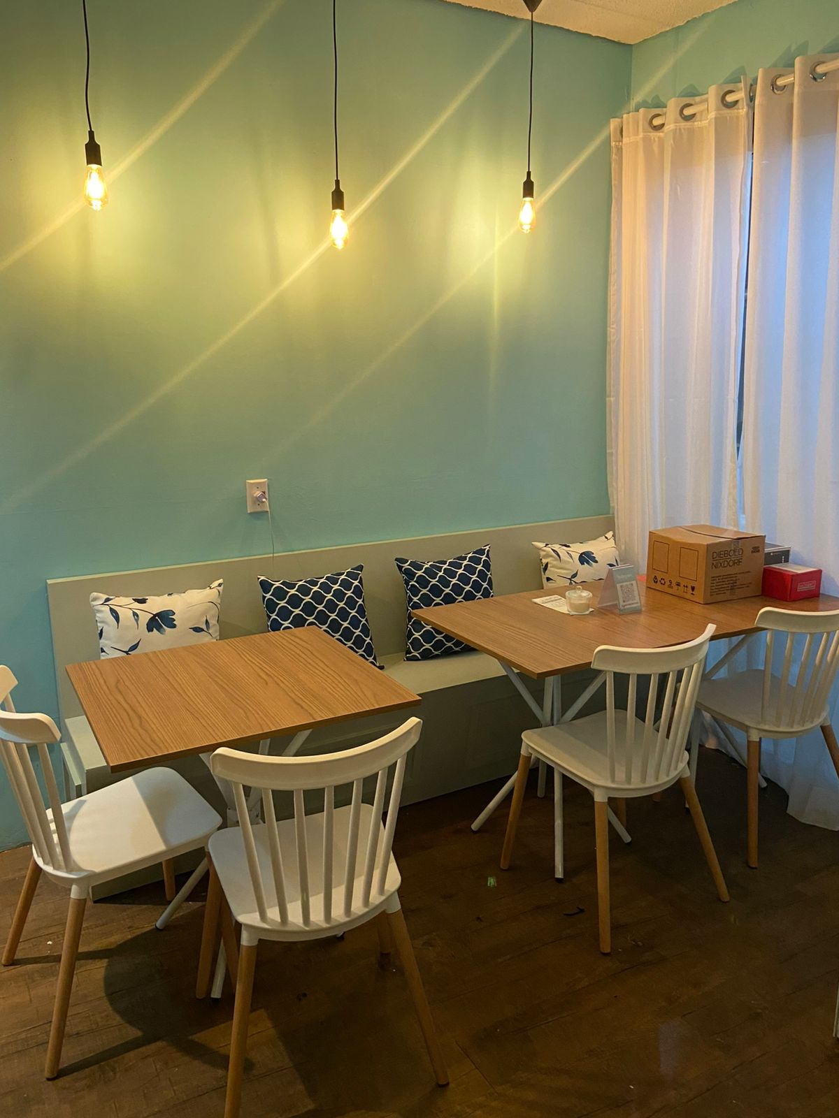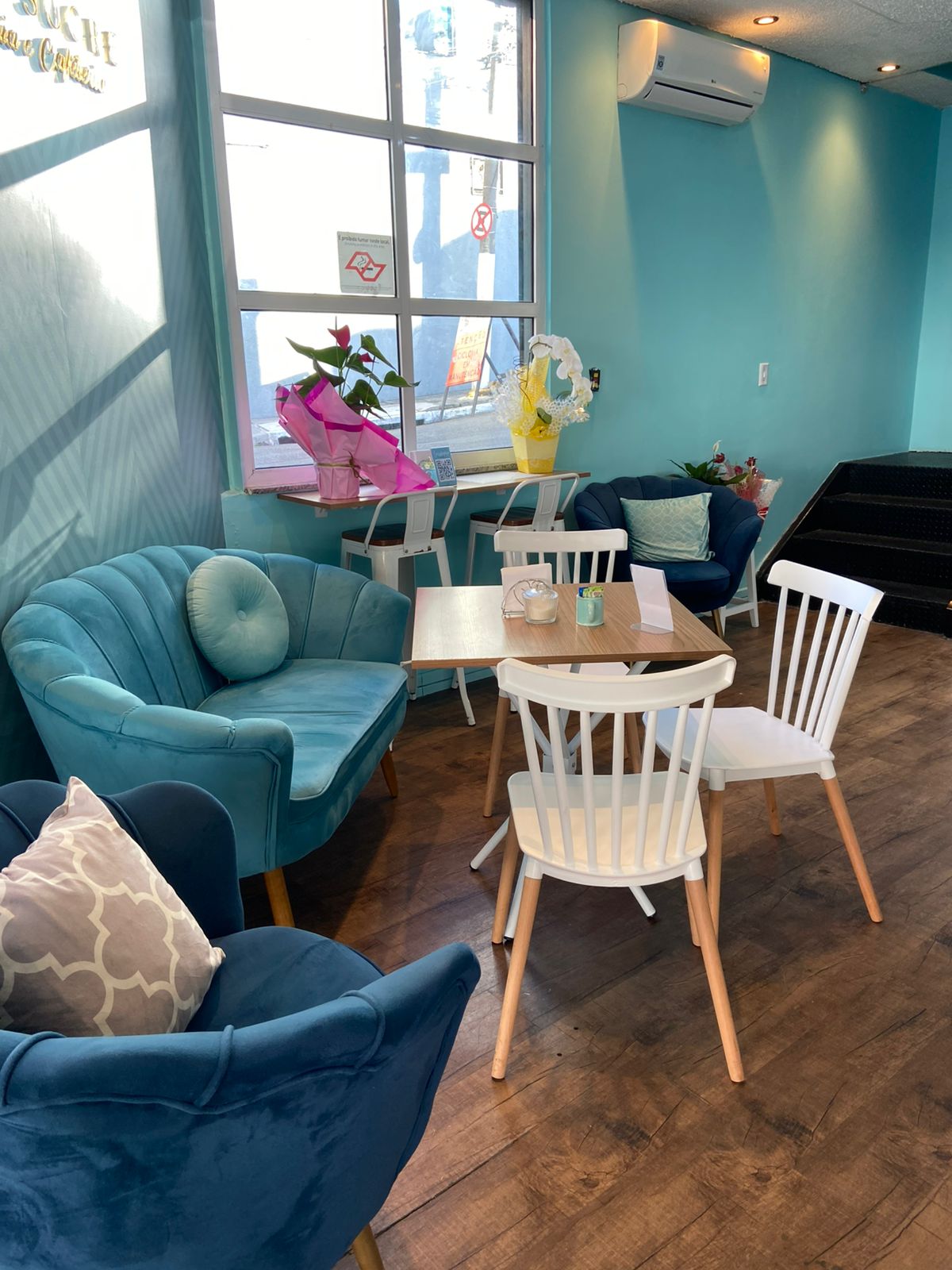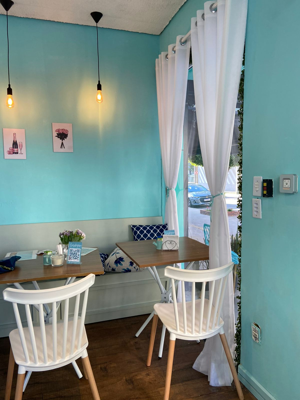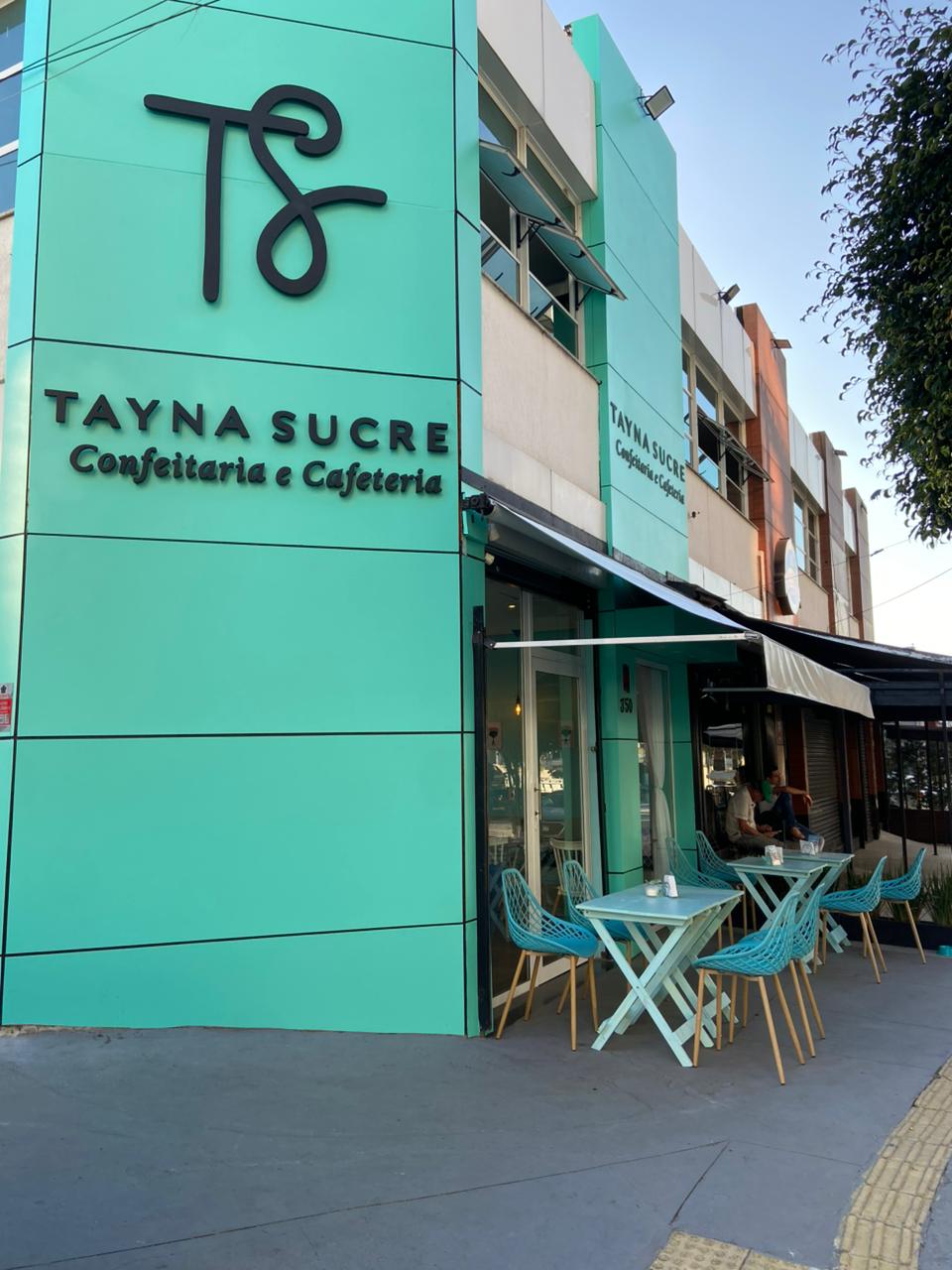 A identidade visual da confeitaria também tem um papel importante nesse conjunto. O tom Tiffany, escolhido como cor principal, reforça o ar delicado e moderno do ambiente.