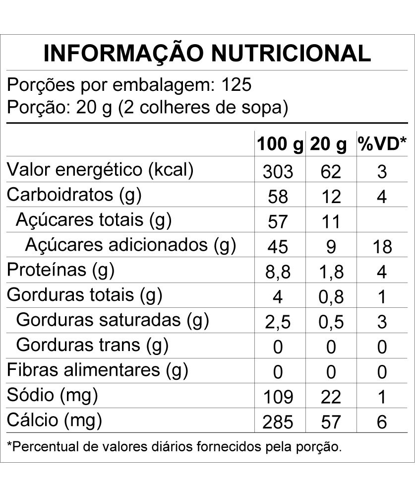 Modo de conservação: Não necessita de refrigeração. Manter em local fresco, seco e limpo. Após aberto, substituir por embalagem plástica ou de vidro com tampa. Manter na geladeira (5ºC a 8ºC). Consumir em até 5 dias.